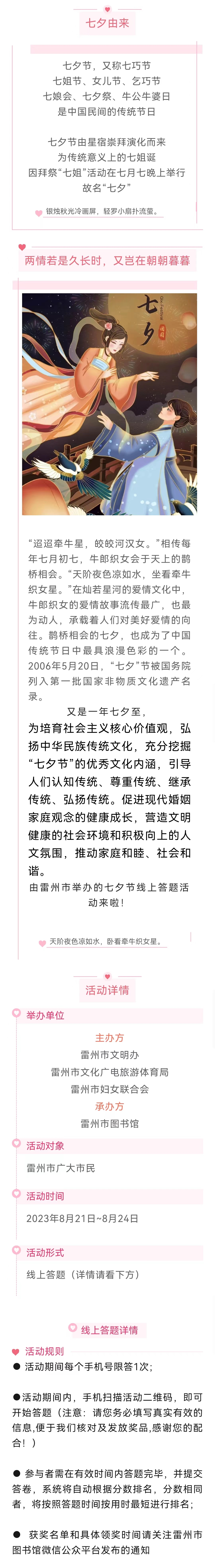 以七夕节传统文化知识为基础,总共设有20道题供读者作答,并以分数和答题时间早晚和长短的排名来决定获奖者。