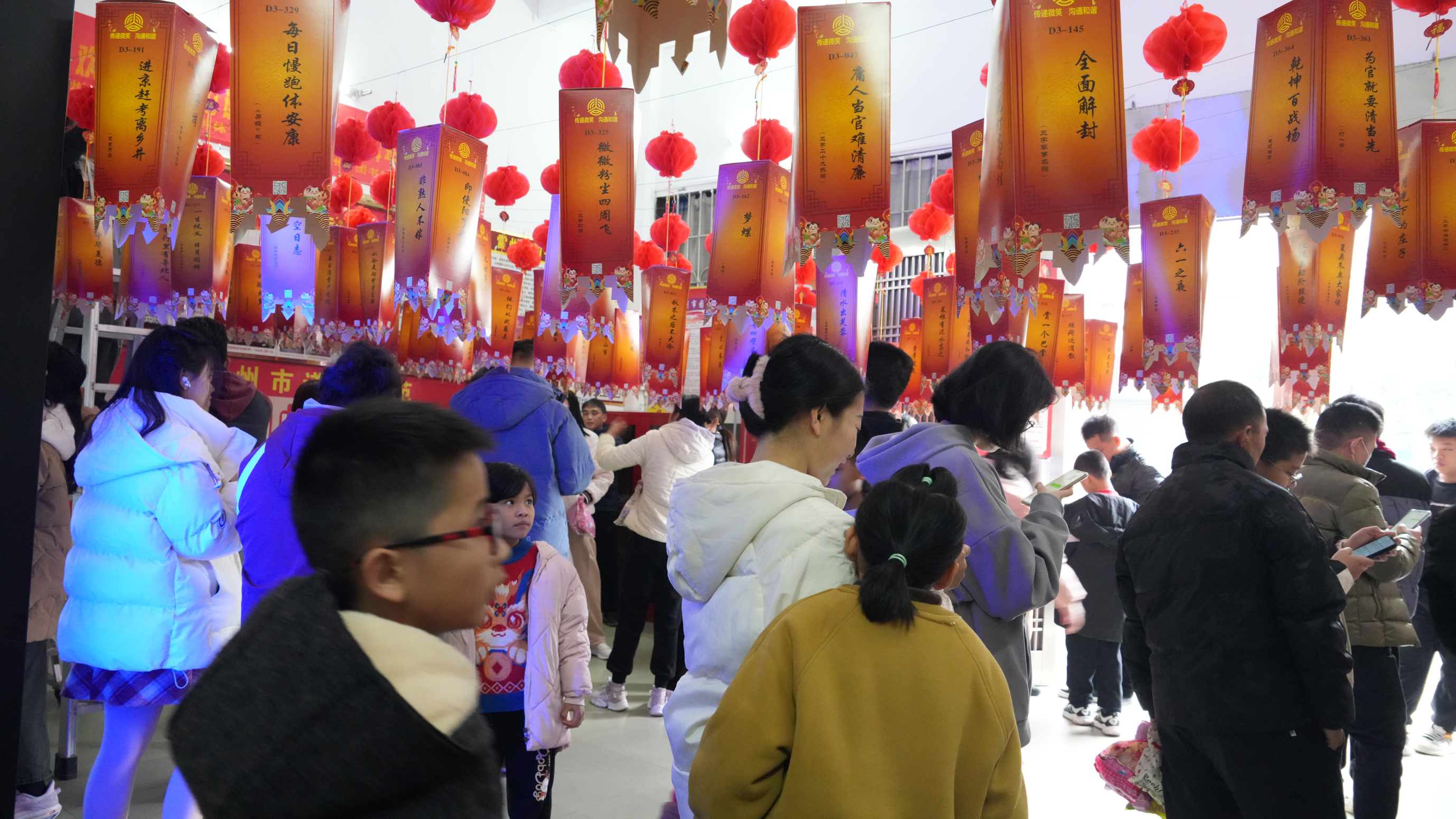 在市图书馆一楼大厅,500个写着谜语的传统彩灯高高挂起,洋溢着节日的喜庆氛围。市图书馆工作人员精心挑选的灯谜,内容涵盖灯谜内容包括综合百科知识、传统文化、党的二十大报告、党史知识、法律法规、脱贫攻坚、乡村振兴、时事政治、社会主义核心价值观、全民抗疫等主题内容等。一条条有趣的谜语引起了群众浓厚的兴趣,现场一片喜庆的热闹景象。市民或携妻带子,或三五成群,认真琢磨,不时为了一条谜语互相讨论。