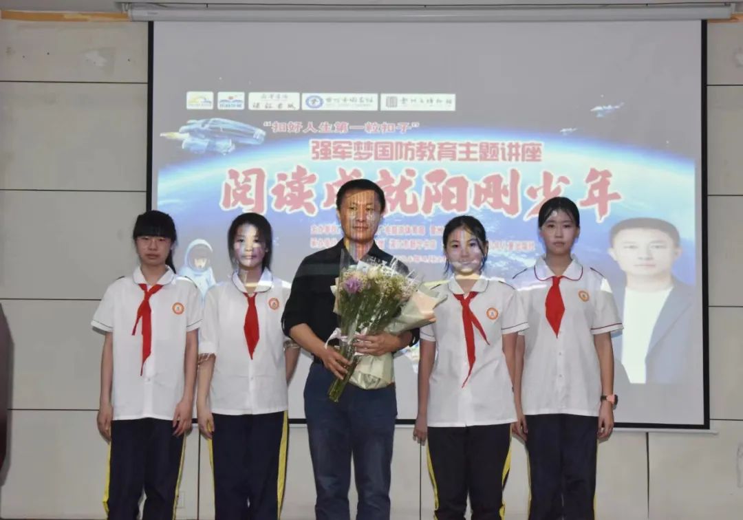 邀请著名作家八路给青少年作“‘强军梦’--阅读成就阳刚少年”阅读写作分享。他简单介绍少儿军事文学发展史,分享自己的创作初衷;阐述了“阳刚文学作品”对于弘扬“阳刚之气”的意义,让优秀的爱国主义国防教育读本《特种兵学校》系列在孩子在心中播种家国情怀的种子,提升保家卫国的责任感。他希望青少年借助阅读来了解国防、关注军事、强化国防意识,在阅读中成为负责任、有担当的阳刚少年。少先队员现场为八路作家献上鲜花以示感谢。